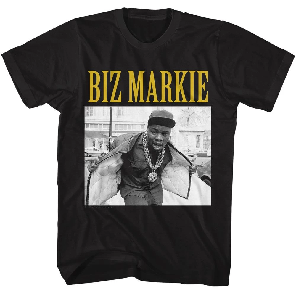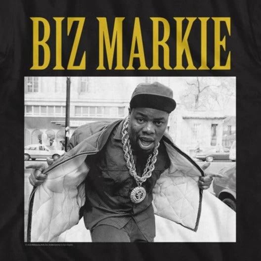 Stay stylish and stand out with our Biz Markie Biz Jacket T-Shirt! This comfy and unique tee features a jacket illustration of the legendary rapper, Biz Markie. The bold and striking colors make this one-of-a-kind piece sure to turn heads. Get your Biz Markie Biz Jacket T-Shirt now and rock it with pride!