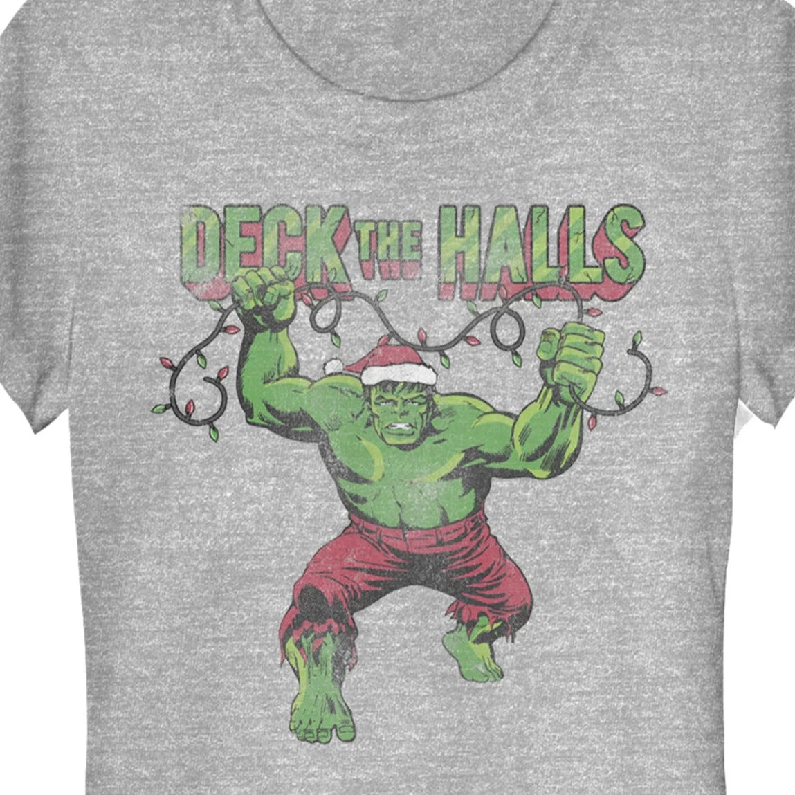 Hulk is getting into the festive spirit with some green and? more green! The Hulk might not be wearing red and green but he’s still getting into the spirit with this officially licensed Marvel Christmas Hulk Deck the Halls Juniors’ Graphic T-Shirt. A distressed graphic shows off Hulk wearing a Santa Claus hat and holding Christmas lights beneath the festive text “Deck the Halls” across the front of this fitted tee.