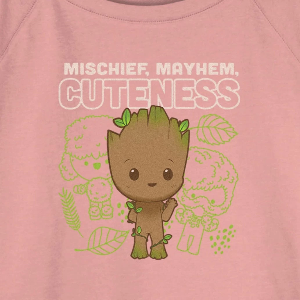 Get ready to hang out with the cutest sapling in the entire forest with this adorable officially licensed Marvel Groot Mischief Mayhem Cuteness Cartoon Juniors’ Graphic Raglan Pullover! An adorable Baby Groot cartoon waves out at you from this wide neckline sweatshirt, with 3/4 length sleeves, that reads “Mischief, Mayhem, Cuteness” in white across the front. You’ll be ready for all sorts of mischief in this stylish sweatshirt!