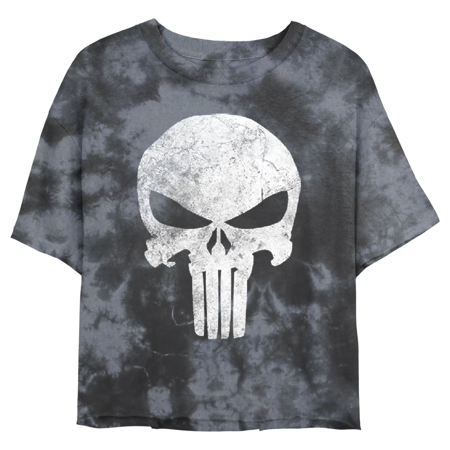 Prepare to meet the symbol of punishment on the officially licensed Marvel Punisher Retro Skull Symbol Juniors’ Graphic Bombard Tie-Dye T-Shirt! The infamous white skull emblem for the Punisher is printed in a distressed vintage style on this crop top that will be sure to make you feel like the infamous anti-hero. You’ll love this retro fashion that shows off a vintage faded look and raw cropped seam and is perfect for comic book fans everywhere!