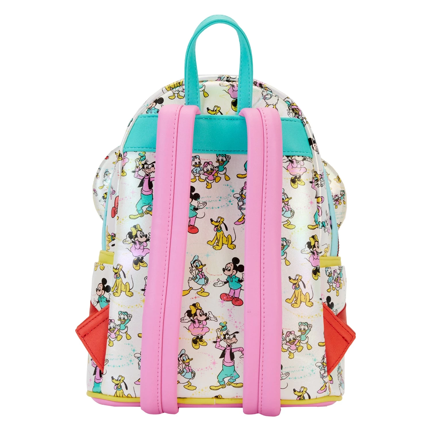 Make heading out even more magical with this Loungefly Disney mini backpack. Featuring a fun all-over print featuring Mickey, Minnie, Donald, Daisy, Pluto, and Goofy, this faux-leather bag is perfect for all your essentials. With adjustable padded straps, pocket-filled side and front pockets, and a removable bow headband, this backpack is as stylish as it is practical. Get ready for adventure!