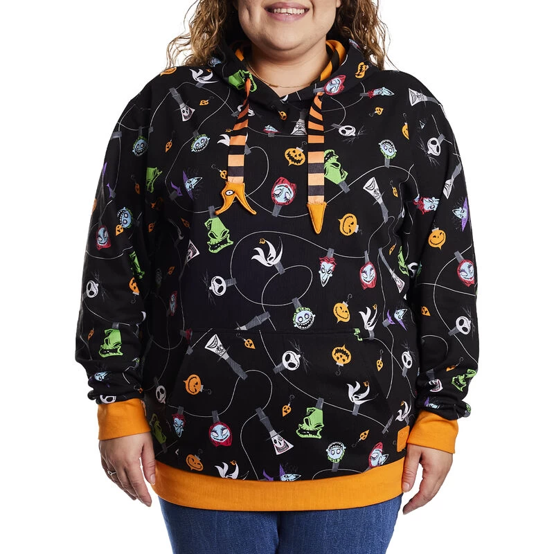 Make the holidays spooky with our Loungefly hoodie featuring a 3D snake head on lanyard drawstrings and a festive AOP pattern of your favorite characters from Halloween Town! Get ready to thrill and chill this holiday season – order yours now!
