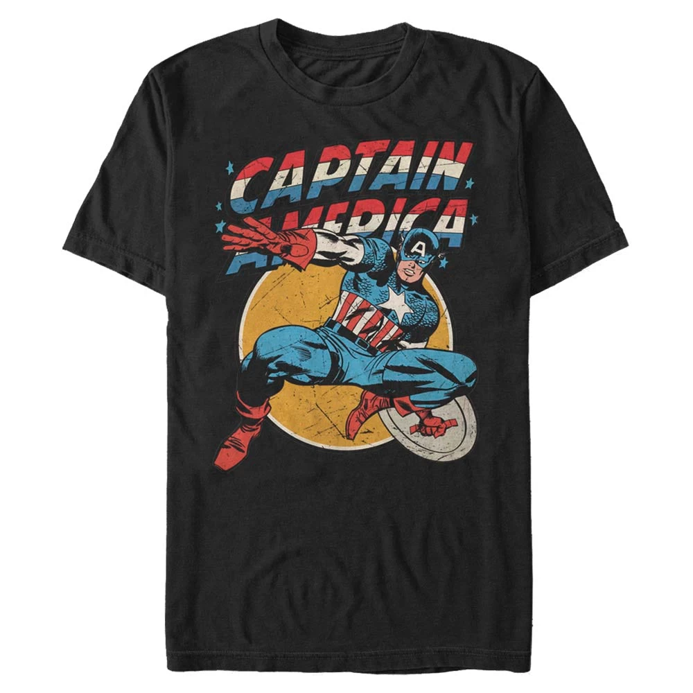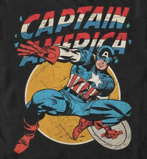 Captain America’s trusty circular shield is indestructible on the officially licensed Marvel Captain America Retro Patriotic Jump Men’s Graphic T-Shirt. This awesome vintage men’s tee features Captain America in a distressed scratchy style as he throws his iconic shield, while “Captain America” is printed in patriotic red, white, and blue text on the front. You’ll love this retro Captain America fashion that is perfect for Marvel comic book fans everywhere!