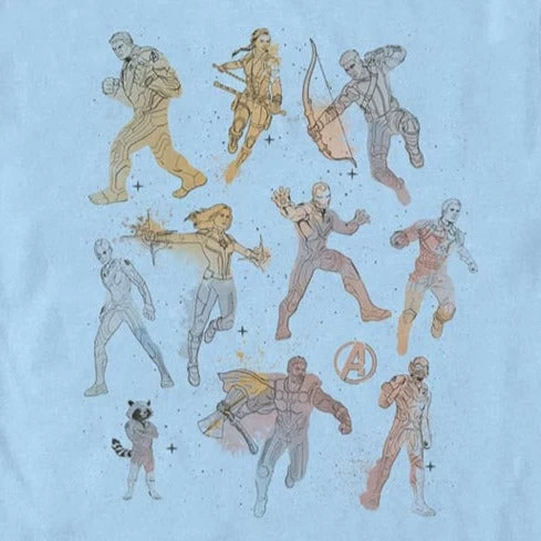 Thanos destroyed half of all living things, but thankfully this officially licensed Marvel Avengers: Endgame Watercolor Hero Constellations Men’s Graphic T-Shirt survived! This unique men’s tee shows off heroes like Rocket, Captain Marvel, Iron Man, Hulk, Nebula, and Thor in a soft watercolor style on a starry background, reminiscent of constellations. Part of the journey is the end so be sure to have this Marvel Avengers: Endgame tee when you get there!