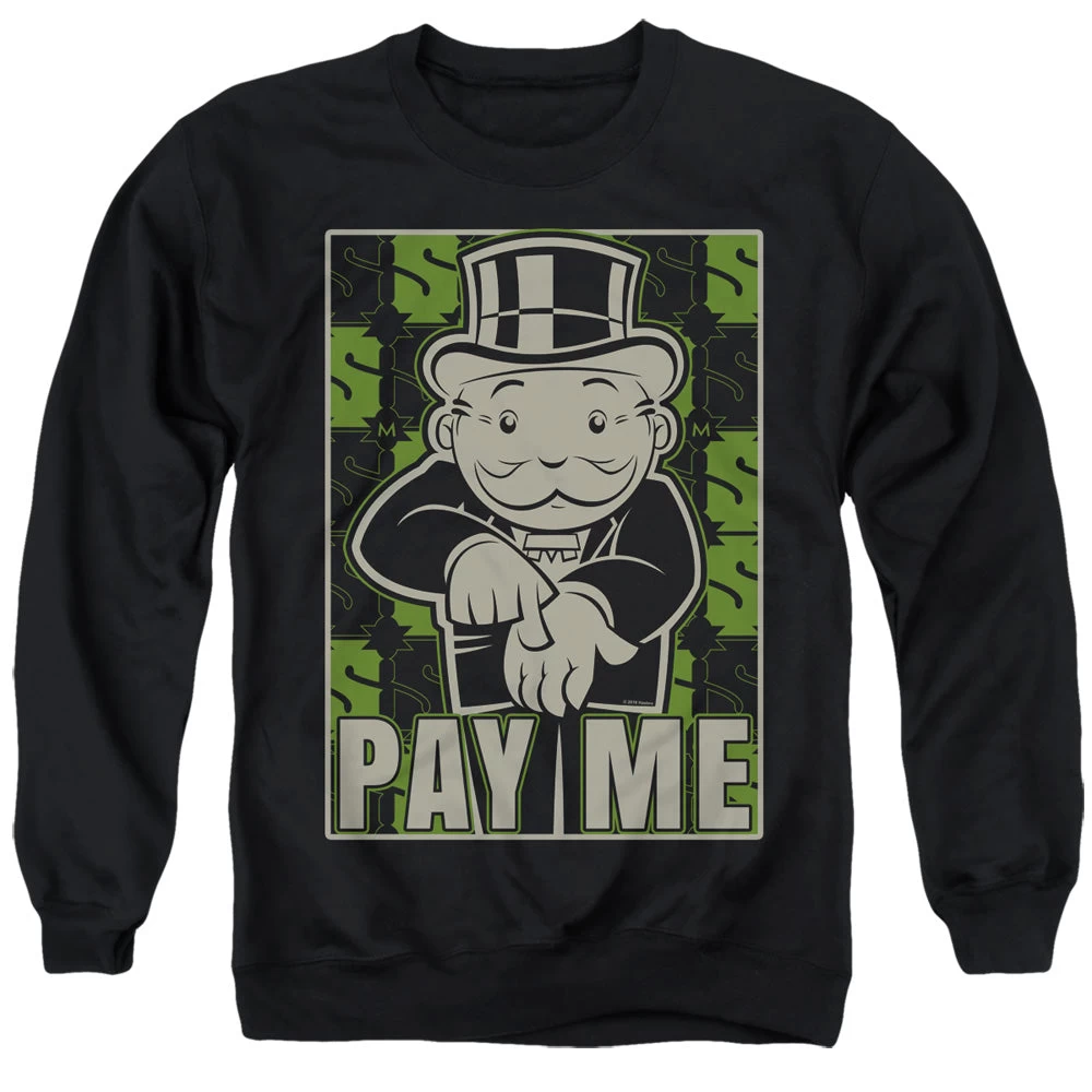 In the classic Hasbro board game Monopoly, are you the one that is paying or the one that is getting paid? This men’s crew neck sweatshirt feature Rich Uncle Pennybags printed on the front with text saying “Pay Me!”