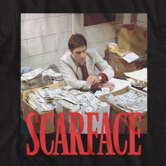 This Scarface Money Stack T-Shirt, featuring Tony Montana’s iconic currency-laden art, is the perfect way to show off your favorite gangsta movie. Crafted from 100% cotton, this T-Shirt is both durable and comfortable. Show your appreciation of the classic movie with this stylish T-Shirt.