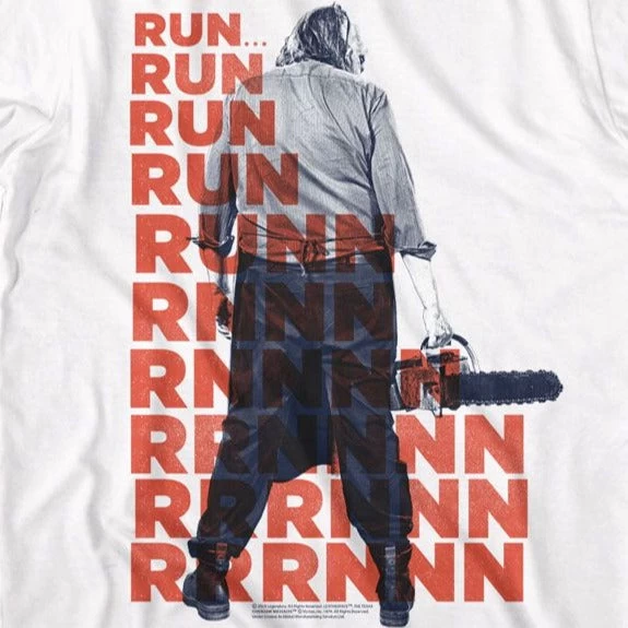 Live in fear and style with our Texas Chainsaw Massacre RunRunRunRun T-Shirt! This ultra-soft and comfortable shirt is sure to help you make a statement, and the bold designs will look great on everyone! Show your love for this thrilling classic and turn heads when you wear this T-shirt!