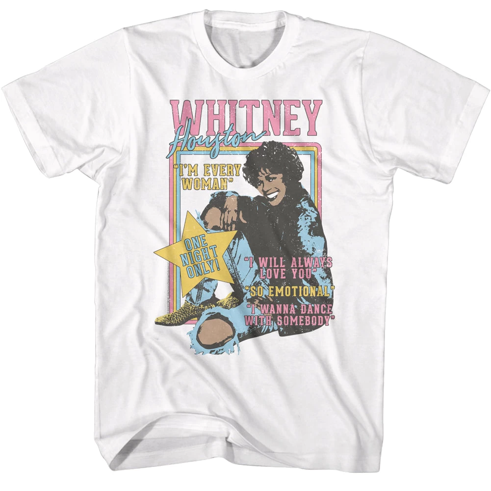 Introducing our exclusive Whitney Houston One Night Only T-Shirt, the perfect tribute to one of the greatest voices in music history. This 100% cotton shirt features a retro poster photo of Whitney Houston, capturing her iconic beauty and powerful stage presence. The white color of the shirt makes the image stand out, making it a true eye-catching piece. This shirt is perfect for any Whitney Houston fan, whether you’re a long-time admirer or just discovering her music. It’s perfect for any casual occasion, from a day out with friends to a concert or music festival. With its comfortable fit and high-quality construction, this shirt is sure to become a staple in your wardrobe. Not only does it pay homage to the late great singer, but it also serves as a reminder of her timeless music that will continue to be loved for years to come. So don’t miss out on the chance to own a piece of music history and get your Whitney Houston One Night Only T-Shirt today!